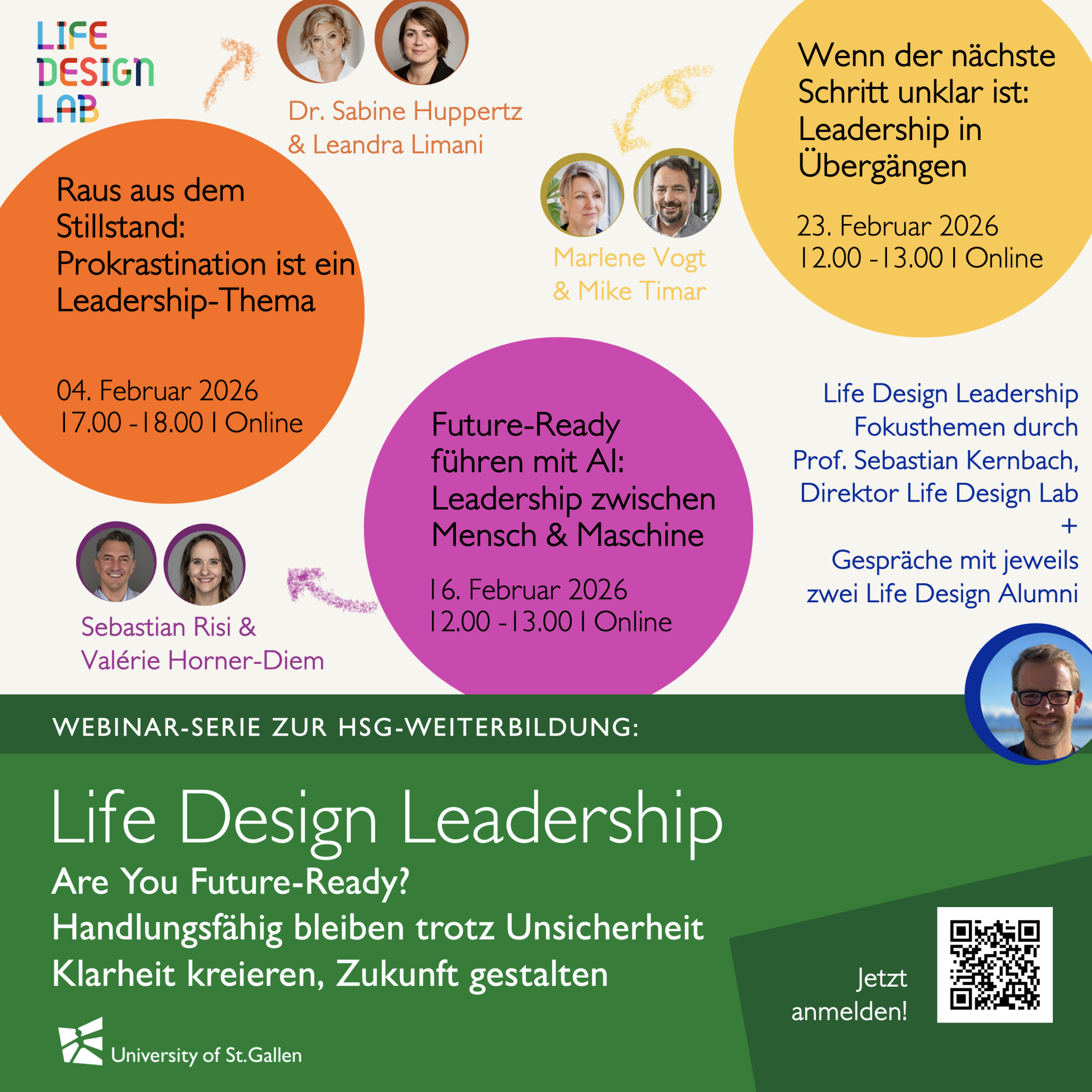 Die Veranstaltungen sind zugleich Info-Events zur HSG-Weiterbildung Life Design Leadership, die im März 2026 startet. Teilnehmende erfahren aus erster Hand, welche Themen, Formate und Faculty sie erwarten und wie Life Design Leadership Führung, Selbstentwicklung und proaktive Gestaltung der Zukunft verbindet.